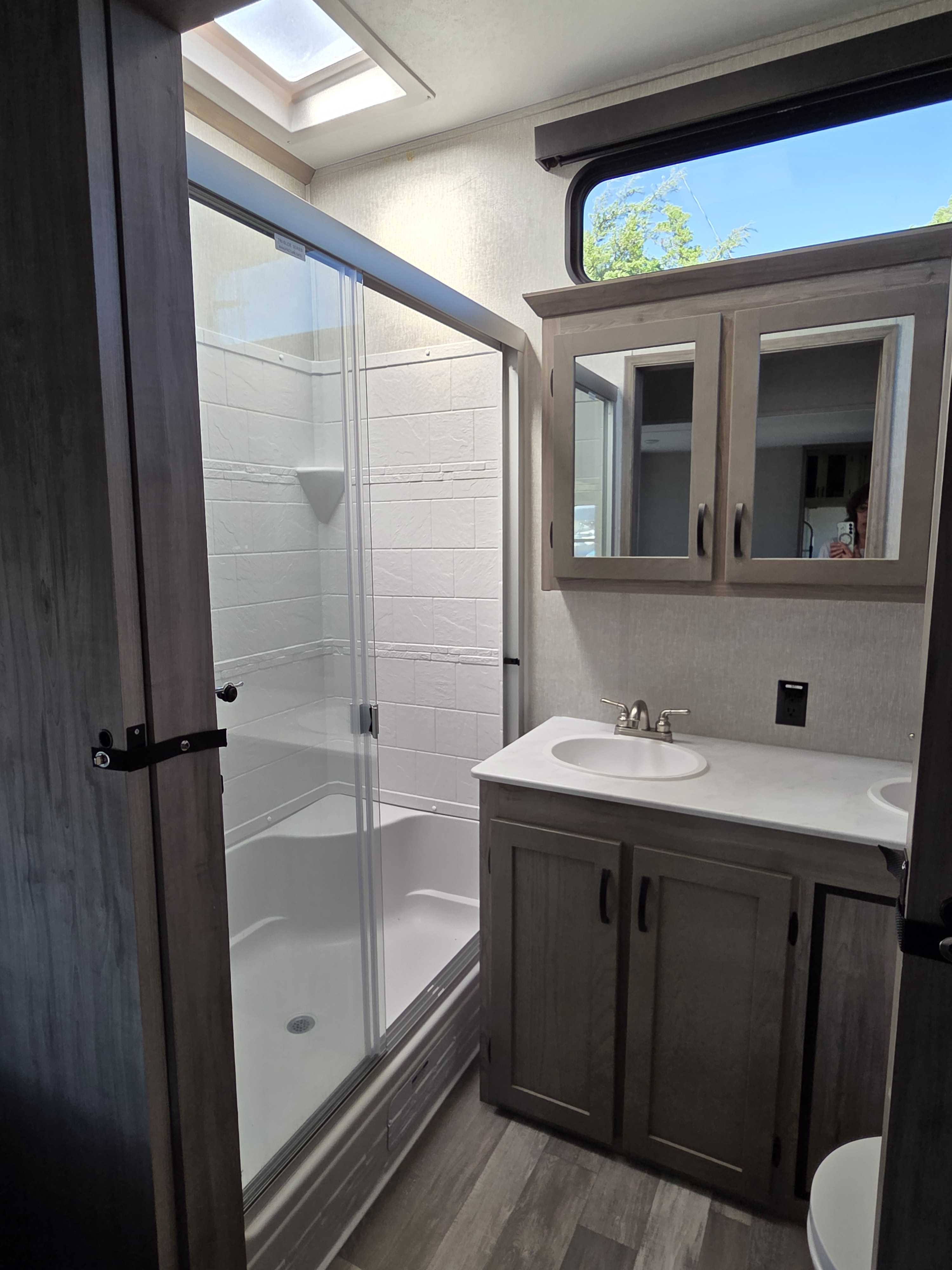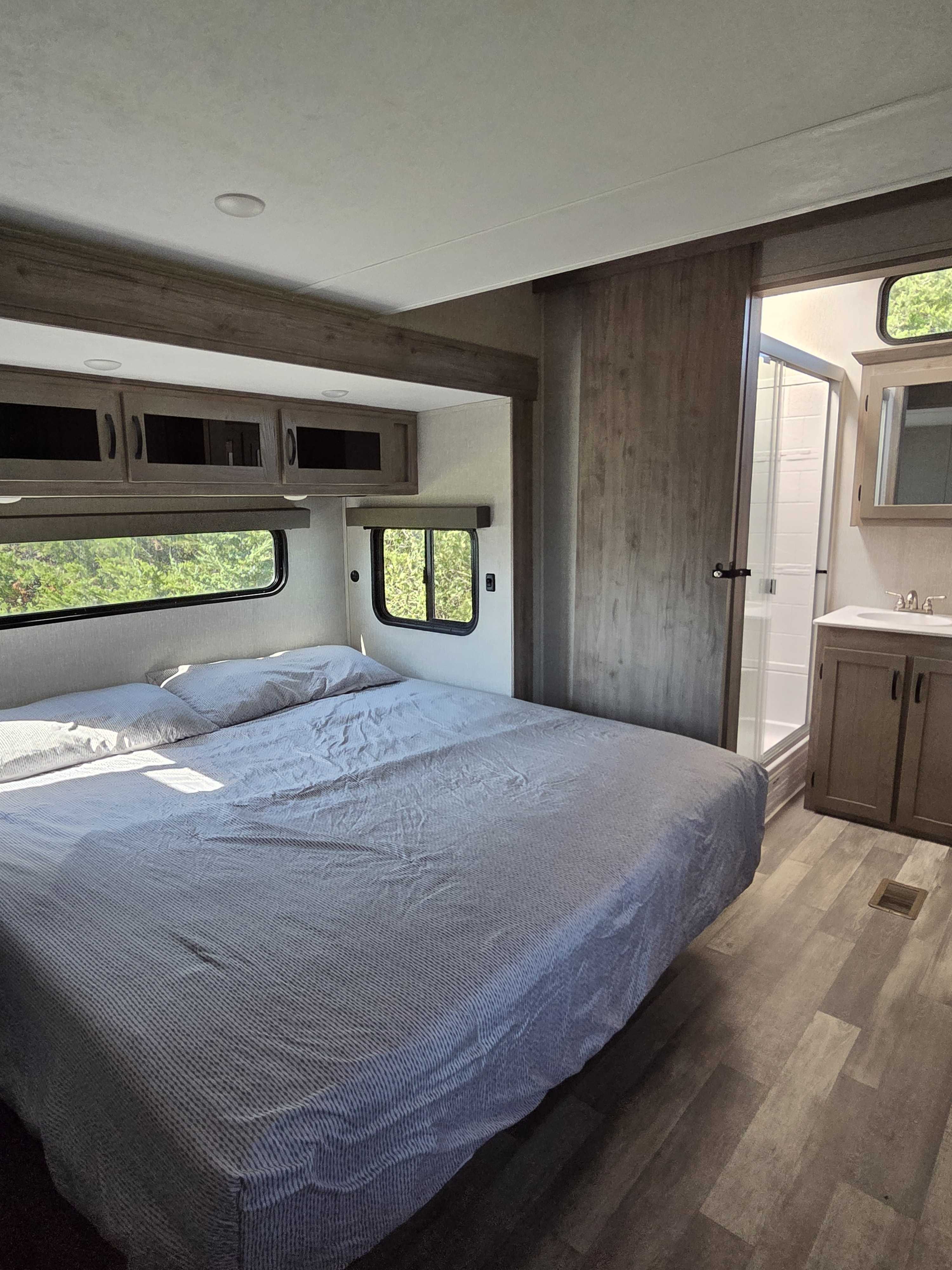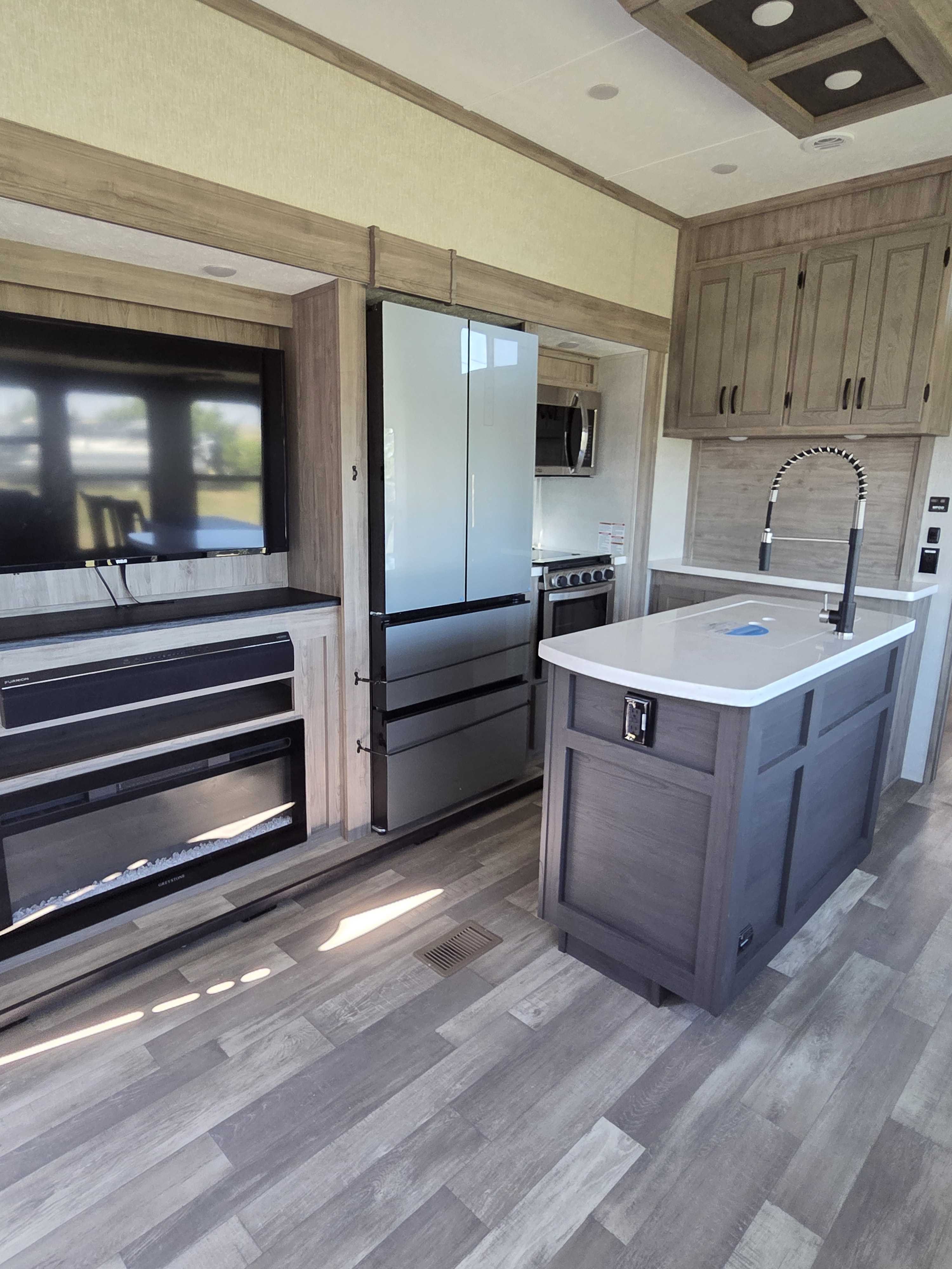 2 Bedrooom (1 King & 1 Queen) spacious loft, and 2 full bathrooms, Both bathrooms include shower, toilet & sink. The Master bath features a massive double vanity. Gourmet Kitchen: Large island with stainless steel sink, 17cu. ft. 12V refrigerator & residential size microwave.