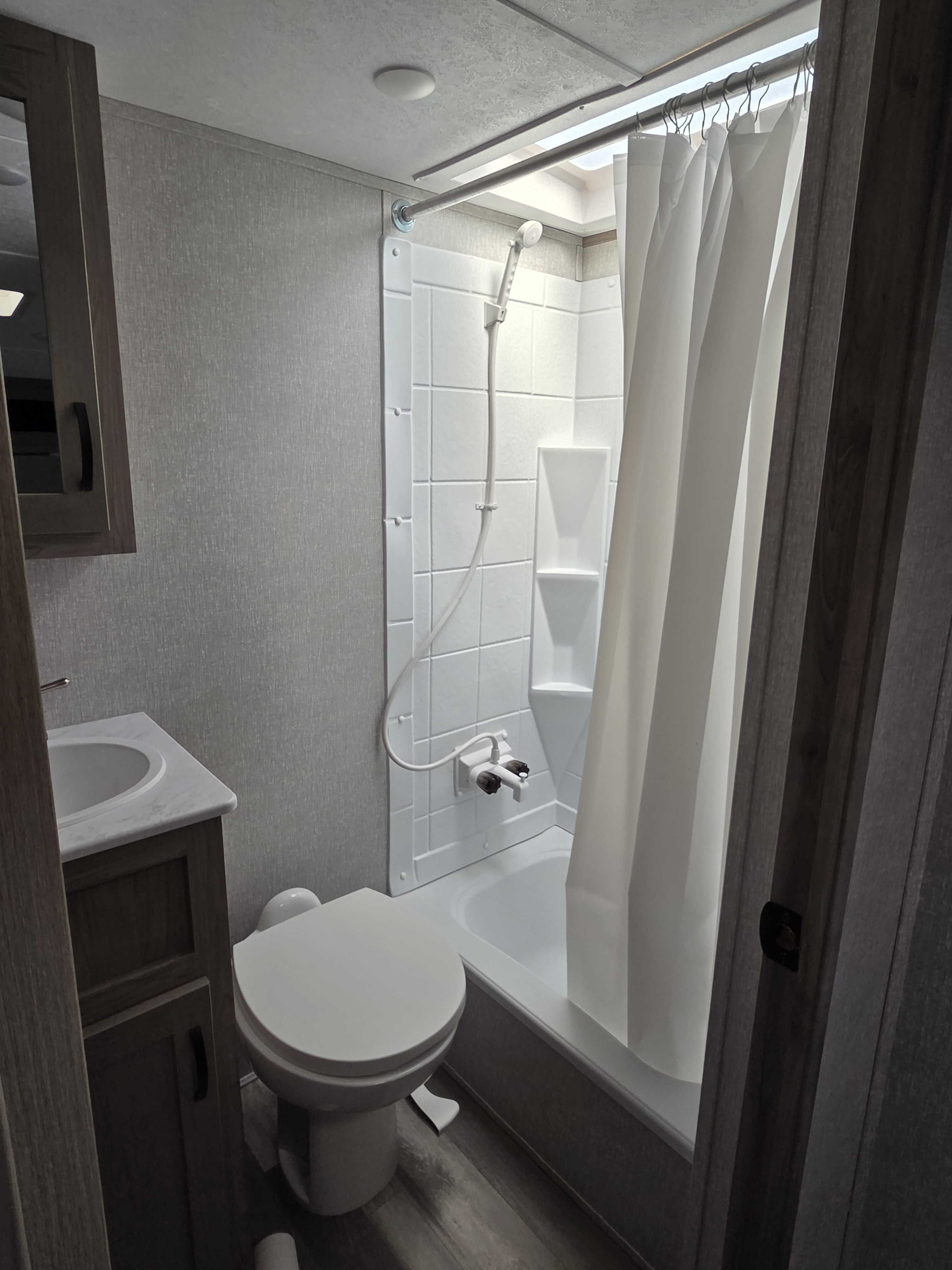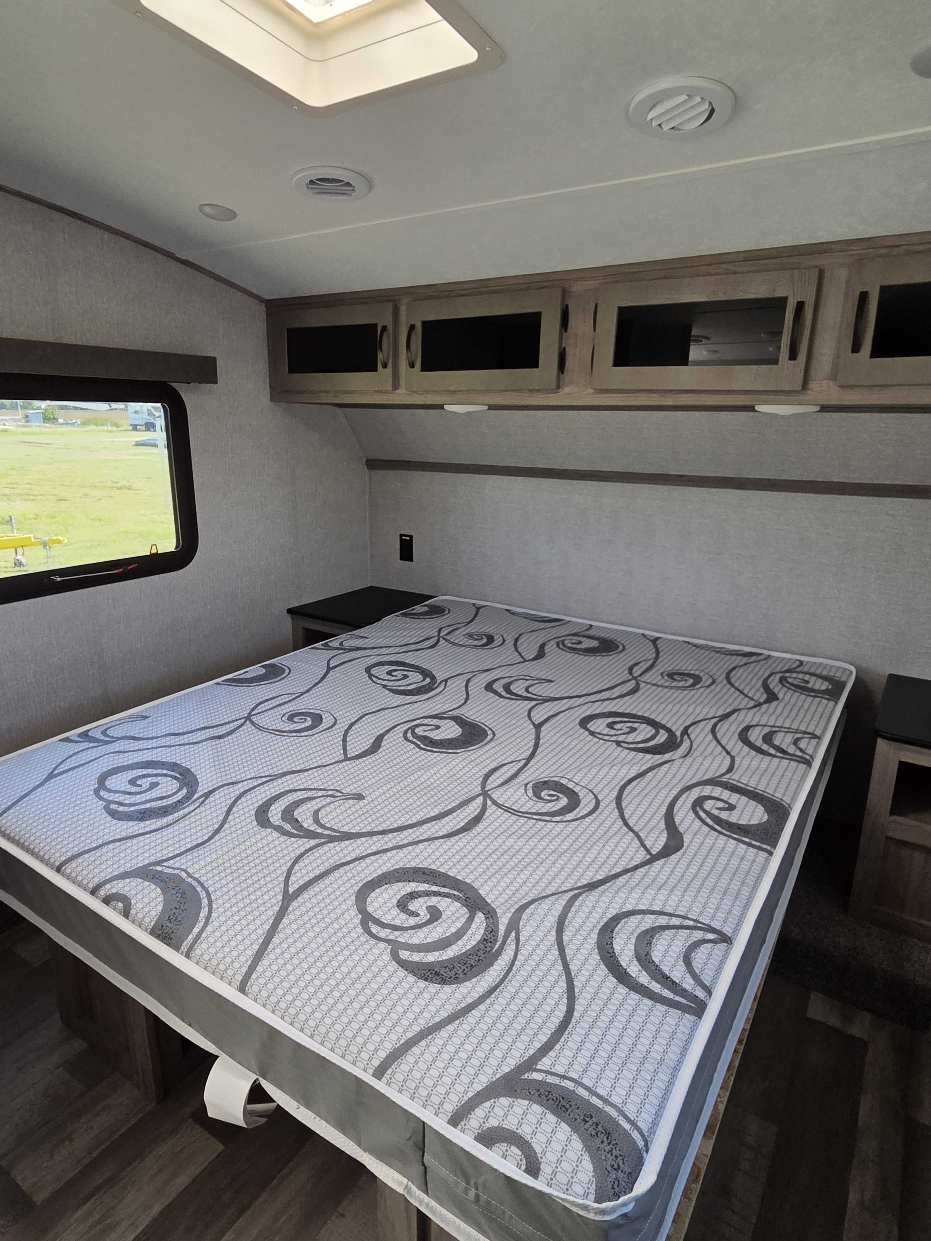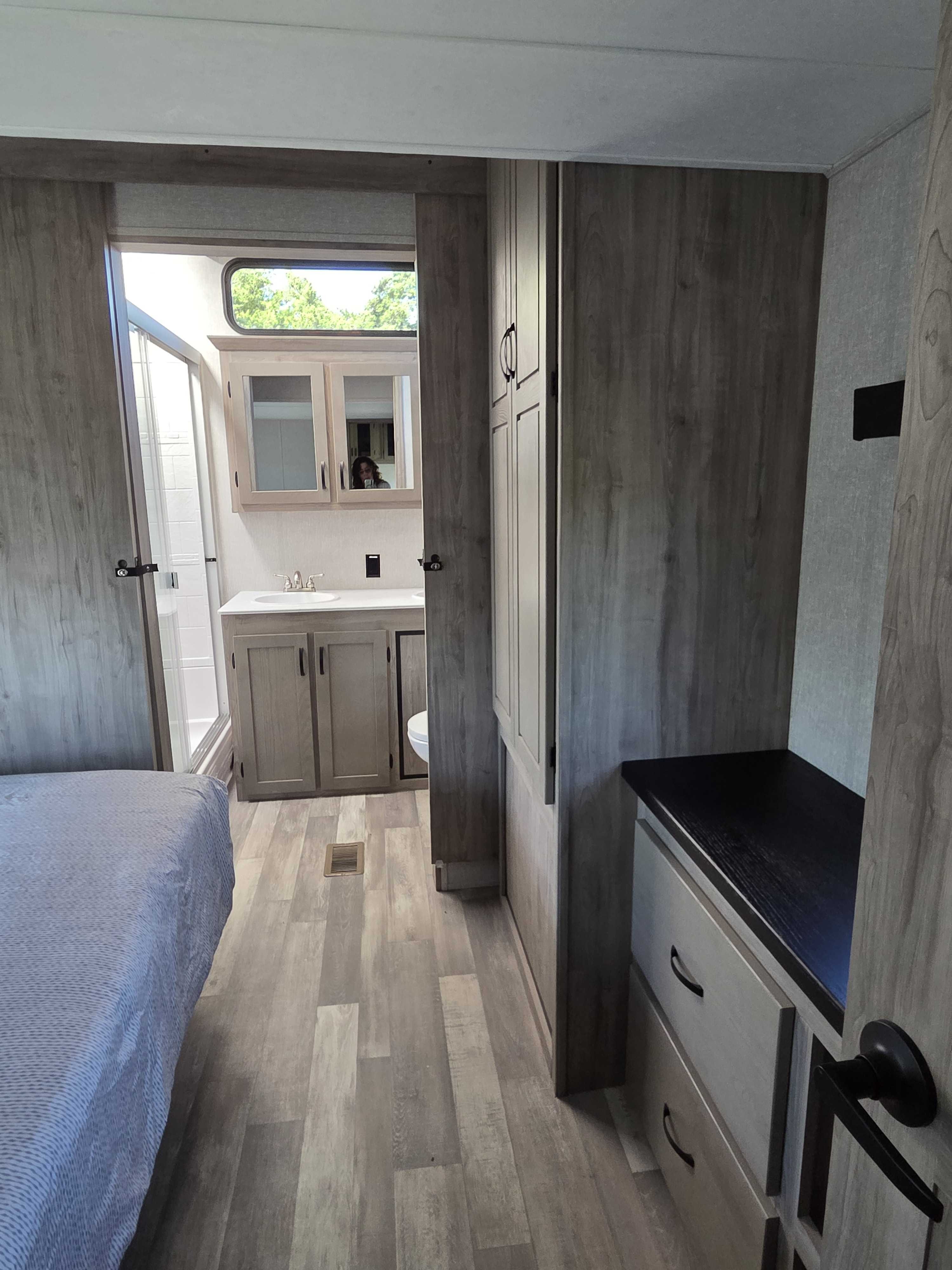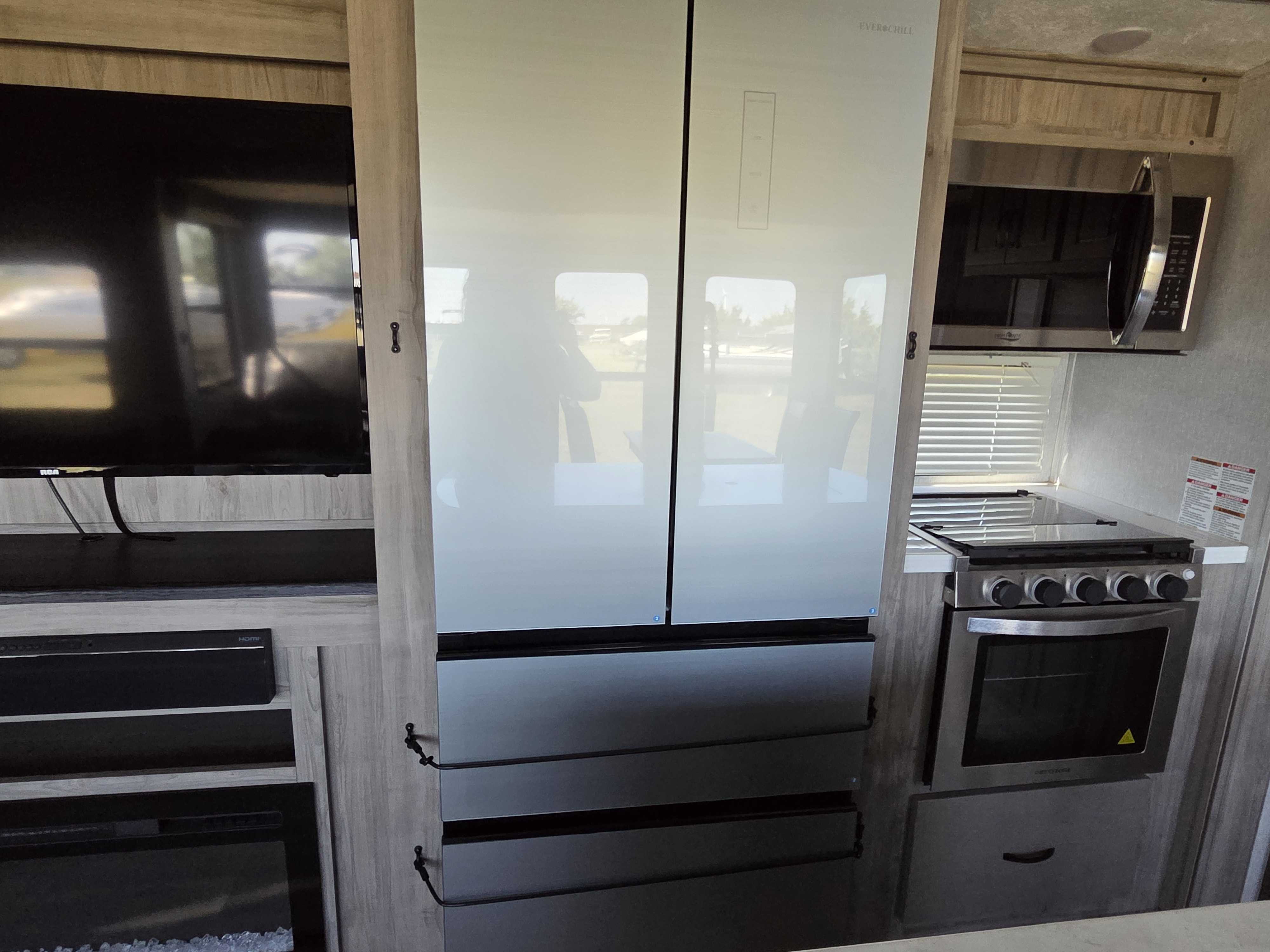 2 Bedrooom (1 King & 1 Queen) spacious loft, and 2 full bathrooms, Both bathrooms include shower, toilet & sink. The Master bath features a massive double vanity. Gourmet Kitchen: Large island with stainless steel sink, 17cu. ft. 12V refrigerator & residential size microwave.
